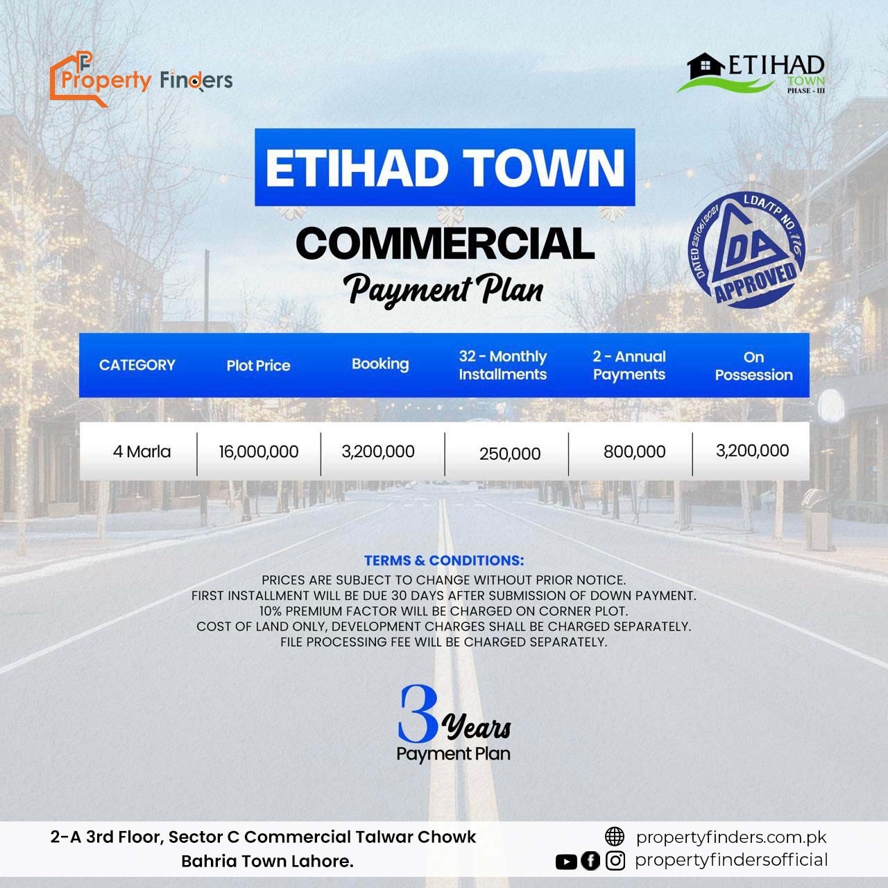 A: All commercial plots are available on a flexible 3-year payment plan with monthly installments.