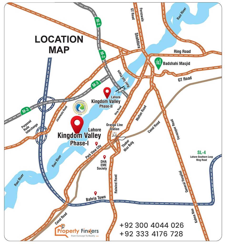 Kingdom Valley Lahore is a housing project by the Lahore Kingdom Group, which is the same team behind the successful Kingdom Valley Islamabad. The new project is being developed near the M-2 motorway and is close to Thakar Niaz Baig-it is easy to reach from different parts of Lahore. Although the official launch date has not been announced yet, the society has already been approved by Ruda and more than 500 canal land has been included, adding more.