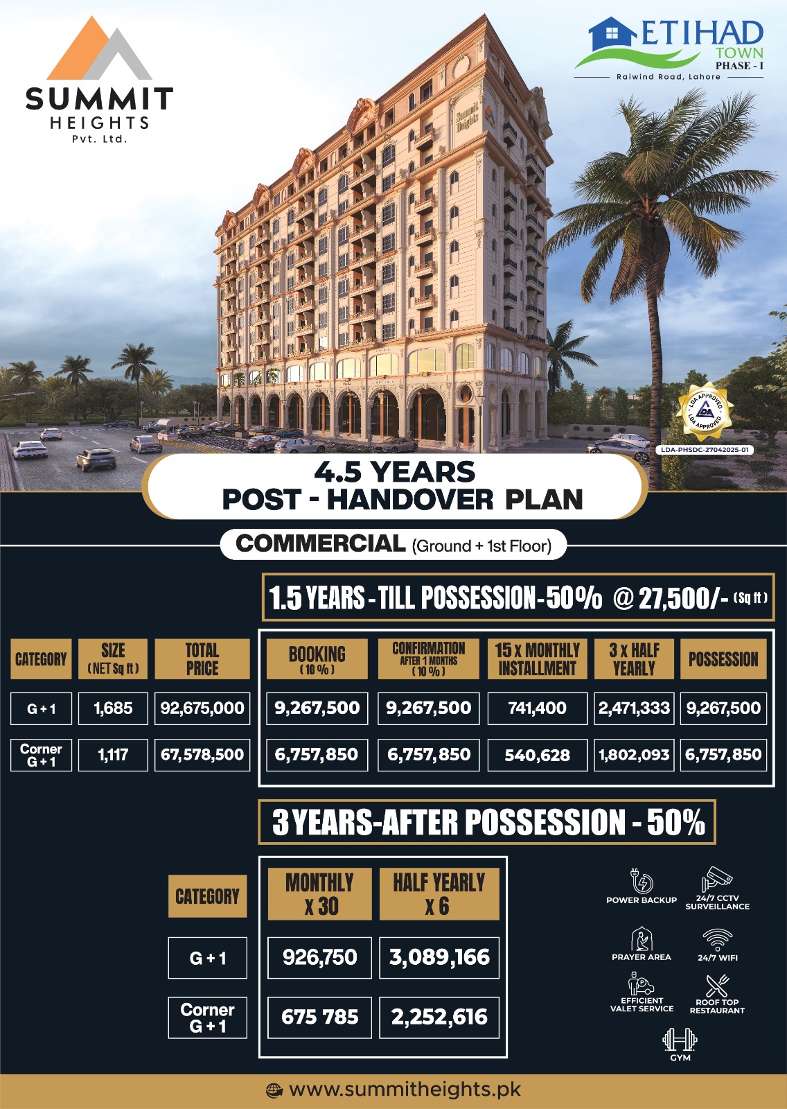 Summit Heights offers a highly flexible 4.5-year post-handover payment plan, making commercial investment more accessible and profitable than ever. Ground + First Floor commercial outlets are available in two prime categories: Standard G+1 (1,685 sq. ft.) and Corner G+1 (1,117 sq. ft.), positioned to ensure high footfall and maximum business visibility. With only 10% booking and 10% confirmation after one month, investors can secure ownership with ease, while the remaining dues are split into convenient 15 monthly installments and 3 half-yearly payments during the 1.5 years leading to possession. The remaining 50% is payable after possession through a 3-year extended plan, offering both 30 monthly and 6 half-year options. This investor-friendly structure is designed for long-term capital growth, enabling businesses to generate revenue even while paying installments. Combined with Summit Heights’ premium location in Etihad Town Phase 1 and top-tier amenities like 24/7 security, valet service, power backup, and rooftop dining — this commercial opportunity becomes an ideal choice for brand expansion and secure investment on Main Raiwind Road, Lahore.